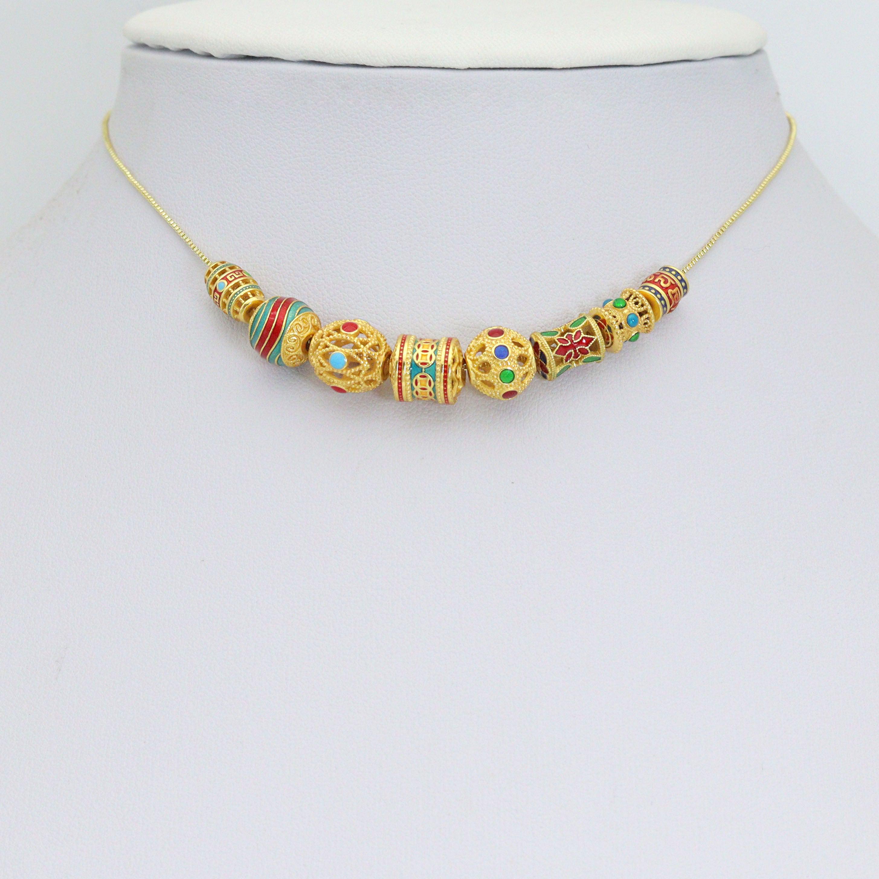Ornate cylindrical bead with red, green, and turquoise enamel details and intricate patterning.