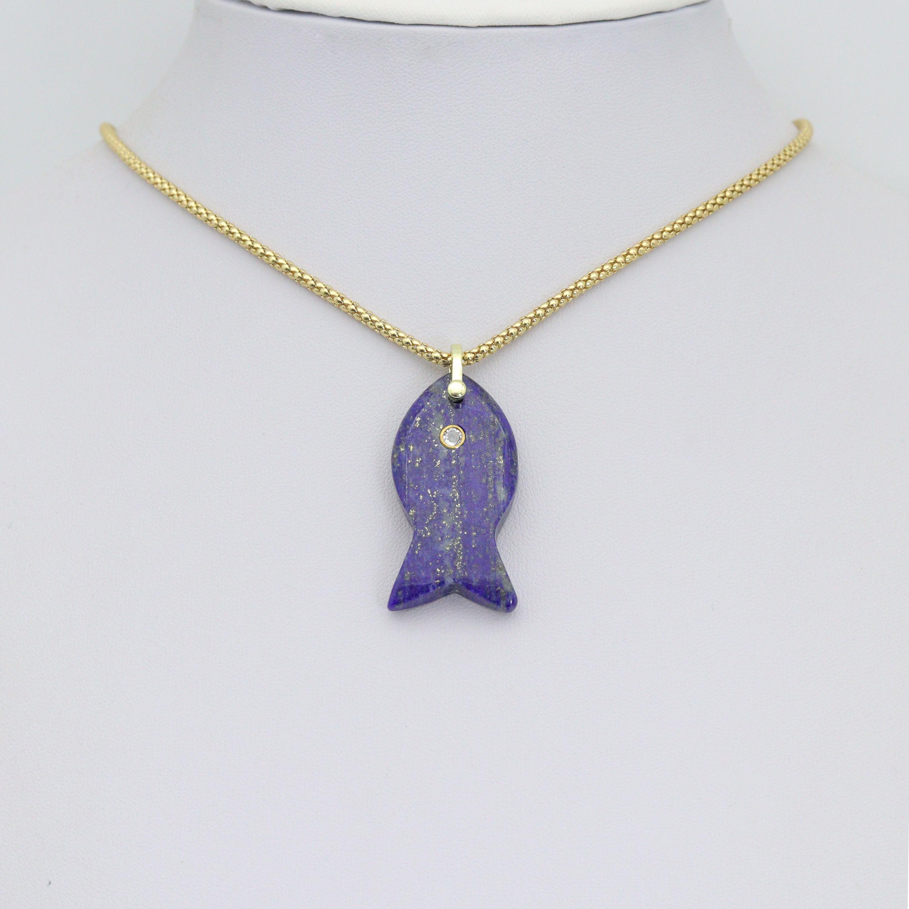 Deep blue lapis lazuli fish pendant with golden specks, a stone of wisdom and truth.